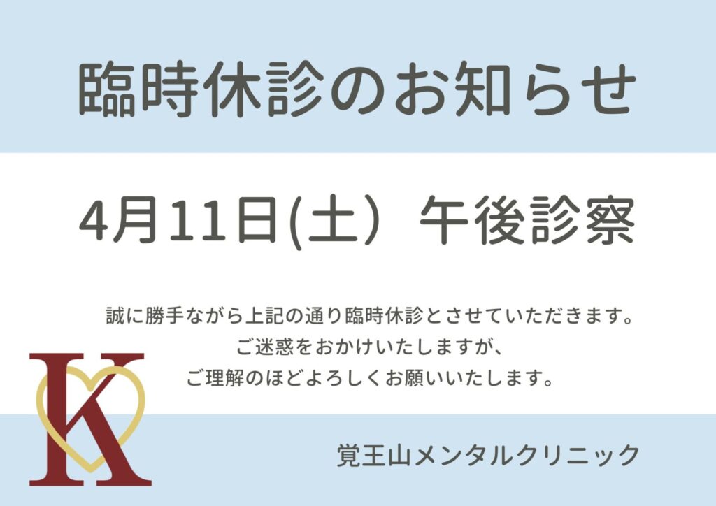上記の通り、令和8年4月11日(土)は院長都合にて午後診察を休診とさせていただきます。